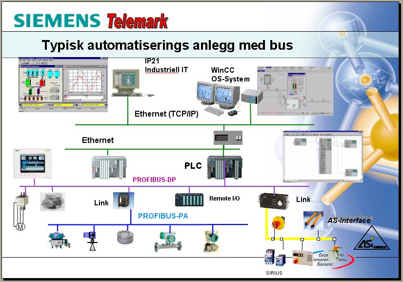 Høgskolen i Agder: MAS107 ReguleringsteknikkImplementeringReguleringsutstyrForelesning Vi ser på bildene i kap. 3 i dette utdraget fra boken Praktisk reguleringsteknikk (bildene supplerer bildene i læreboken Regulering av dynamiske systemer bind 1) Her er et bilde av et typisk automatiseringsanlegg (gjengitt med tillatelse av Bjørnar Bakken, Siemens):
