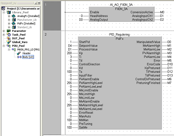 Figur 1 Det er nødvendig å definere minneceller el.l. til alle terminalene AnalogOutput, AnalogInputCh1 og AnalogInputCh2, selv om du faktisk ikke bruker alle disse terminalene i funksjonskallet. Informasjon om PID-funksjonen PidFX i GX IEX DeveloperMitsubishi har laget en funksjonsblokk kalt PidFX, som er tilgjengelig i et User Library kalt PidFX, som er tilgjengelig som en selvutpakkende exe-fil med navn PidFx.exe. Dere kan laste ned exe-filen fra http://www.beijer.no (søk etter f.eks. "pid fx2n"). Den selvutpakkende filen inneholder også hjelp-filen PidFX.chm. Installering og bruk av et nedlastet (og utpakket) User Library (funksjonsblokker og hjelp-fil) er beskrevet i kap. 4.6 i Manual for GX IEC Developer. Når du bruker PIDFx-funksjonen i en POU, må du først opprette en instans av funksjonen i POU'ens header. Dette gjøres helt tilsvarende som for FX0N_3A-funksjonen, jf. beskrivelsen ovenfor. Hjelp-filen PidFX.chm gir informasjon om hvilke verdier som kan angis på de enkelte inngangene på PidFX-blokken, men for å komme litt raskere i mål, gjengir jeg her konfigurering av blokken slik en studentgruppe ved HiBu gjorde det i en laboppgave høsten 2005: