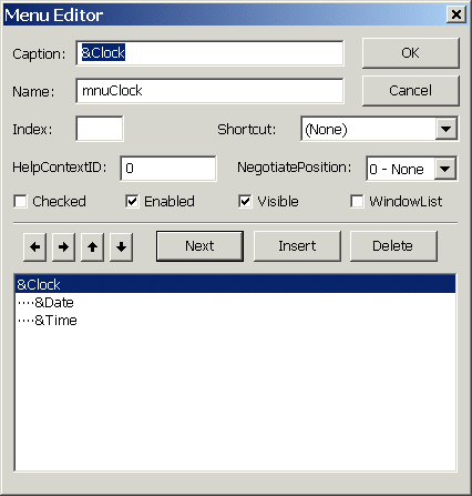 Menyene lages vha. VBs menyeditor, som åpnes med menyvalget Tools