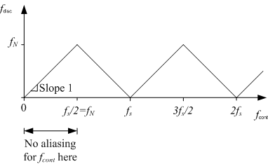 Description of the system to be simulatedSampling of sinusoid, x(t), is simulated. The sampling results the discrete-time signal xs(k) where k is a time index (number of samples). Both signals are plotted simultaneously. You can adjust both the signal frequency and the signal frequency. AimThe aim is to develop an understanding of the aliasing phenomenon. MotivationSampling av continuous-time signals takes place in all applications where a computer is used to read measurement data. If the sampling rate is too low compared to the frequency of the signal to be sampled, aliasing occurs. Aliasing means that the discrete-time signal gets a lower frequency than the original signal. Obviously, sampling can cause problems in applications, e.g. in audio applications. TheoryGiven a continuous-time signal, x(t), of frequency fcont [Hz] which is sampled with sampling frequency fs [Hz]. The Nyquist frequency fN is defined as half of the sampling frequency: fN = fs/2 It ca be shown that if the signal frequency fcont is larger than fN, there is aliasing, which implies that the resulting discrete-time signal, xs, gets a frequency, fdisc, which is smaller than the signal frequency fcont. Figure 1 shows the relation between fdisc and fcont.