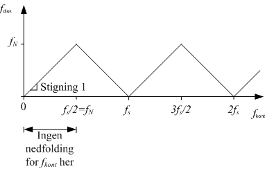 Figur 1 Fra figuren kan vi bl.a. finne at fdisk blir lik differansen fs - fkont dersom fkont er mellom fN og fs, som er det "laveste" frekvensområdet der det oppstår nedfolding. Den engelske betegnelsen på nedfolding er aliasing ("som opptrer under falskt navn"). Oppgaver
