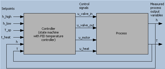 Description of the system to be simulatedThis simulator simulates a sequential control system for a simple batch process. A tank is filled with water. The water is then heated and stirred, and finally the heated water is discharged from ther tank. The simulator is based on the following mathematical model of the process (the individual parameters are defined on the front panel of the simulator): dh/dt=(1/rho)*(1/A)*[K_in*u_valve_in-K_out*u_valve_out] which is based on mass balance, and dT/dt=[1/(c*rho*A*h)]*[K_heat*u_heat+(T_in-T)*c*w_in+(T_env-T)*U] which is based on energy balance. There is a time-delay in the temperature measurement. A stirring motor is controlled by the control signal u_motor The motor is assumed to ensure homogenuous thermal conditions in the water in the tank. The control signals are