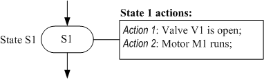 The actions for a given state can be listed in a box attached to the state symbol, see Figure 2. However, the diagram may then become overloaded by symbols. Therefore, in more comprehensive state diagrams, it may be better to just list the actions in a separate document.