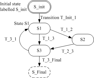 Figure 1: Elements of state diagrams: States and transitions A state diagram represents a state machine. States of a state machine are either active or passive. Only one state is active at a time. The state machine always starts in a particular state defined as the initial state, and it ends (stops) after the final state. Special symbols or colors may be used for the initial state and the final state, cf. Figure 1. Associated with a state are one or more actions. An action may be a control action executed by a controller. Actions may be listed as indicated below: