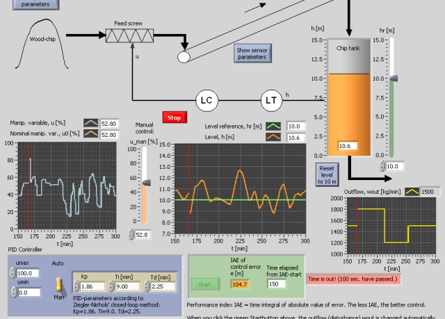 We can say that the less IAE index, the better control. However, the IAE index does not express the control usage, so it may happen that the control usage is abrupt, causing wear on mechanical actuatorsas valves, motors and pumps. When you click the IAE button on the front panel of the simulator, the chip outflow (disturbance) wout and the level setpoint are automatically changed at specific points of time, and the IAE calculation is started to be running for 250 minutes (simulation time). The less IAE you obtain, the better controller you are! AimOne aim is that you experience how a controller works by trying to being a controller yourself, and to observe that it may be difficult to control a process manually equally well as an automatic PI(D) controller does. MotivationMany industrial processes may be controlled manually, i.e. by an operator, but it can be useful to experience that a PI controller can do the job better - and not the least important: to do it automatically. TasksFollow the instructions down to the left on the front panel of the simulator.