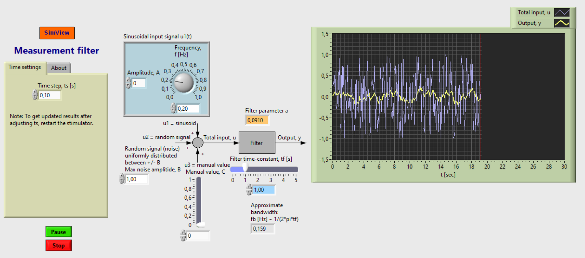MotivationMeasurement filters are frequently needed in practical application based in some processing of measurements. This is because all practical measurements are noisy. Typically the noise is approximately a random signal. The filter is used to attenuate the noise. One very important application is in a control system. The process measurement (temperature, level, pressure, speed etc.) always contains some noise. If the noise is not attenuated it will propagate through the controller and cause abrupt (noisy) variations in the control signal, causing excessive wear of the actuator (pump, valve, motor). Description of the system that is simulatedFilter algorithmy_k = (1 - a)*y_km1 + a*u_k where: y_k is present filter output, y_km is previous filter output ("km1" means k-1), u_k is present filter input. a = ts/(tf + ts) where: ts [s] is time step (or sampling time). tf [s] is filter time constant, or time window of moving averag filter. Input signals to the filterThe input signal to the filter consists of three additive terms: