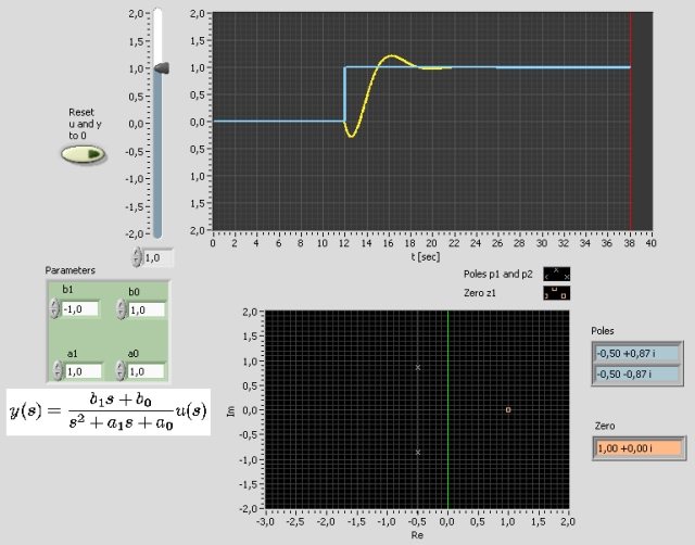 Description of the simulated systemThe following general second order transfer function model is simulated: y(s)/u(s) = H(s) = (b1s + b0)/(s2 + a1s + a0) H(s) can have both poles and zeros. You can determine the coefficients of the numerator and the denominator polynomial. AimsThe aims of this simulator is to develop the understanding of the relation between poles and zeros and the time response of transfer function models. MotivationTransfer function models are frequently used in signal processing (to represent signal filters) and control theory (to represent process models, controllers, and sensors). TasksIt is assumed that you answer the following questions by running the simulator.